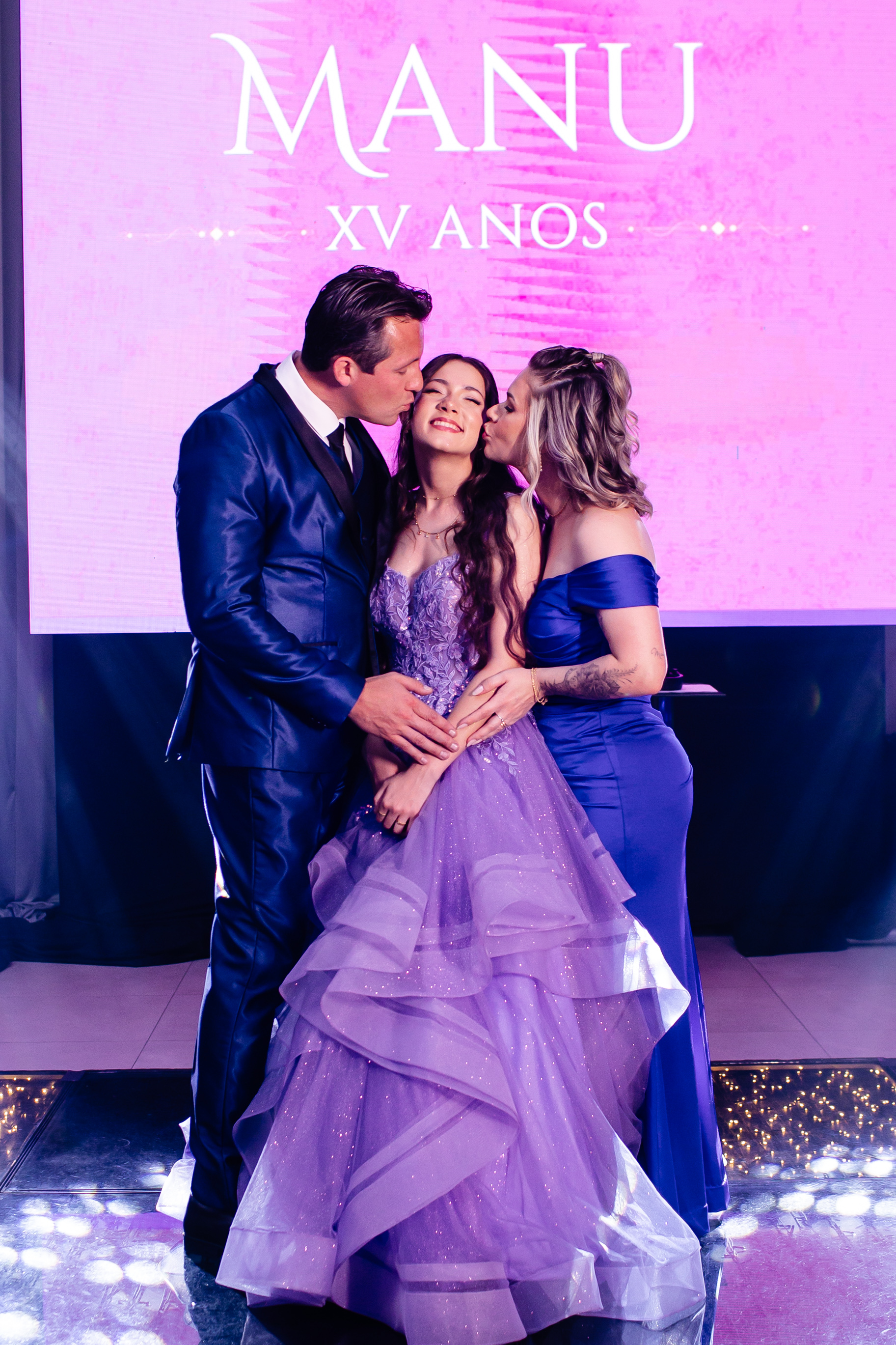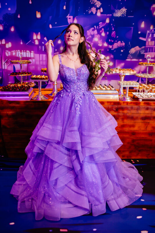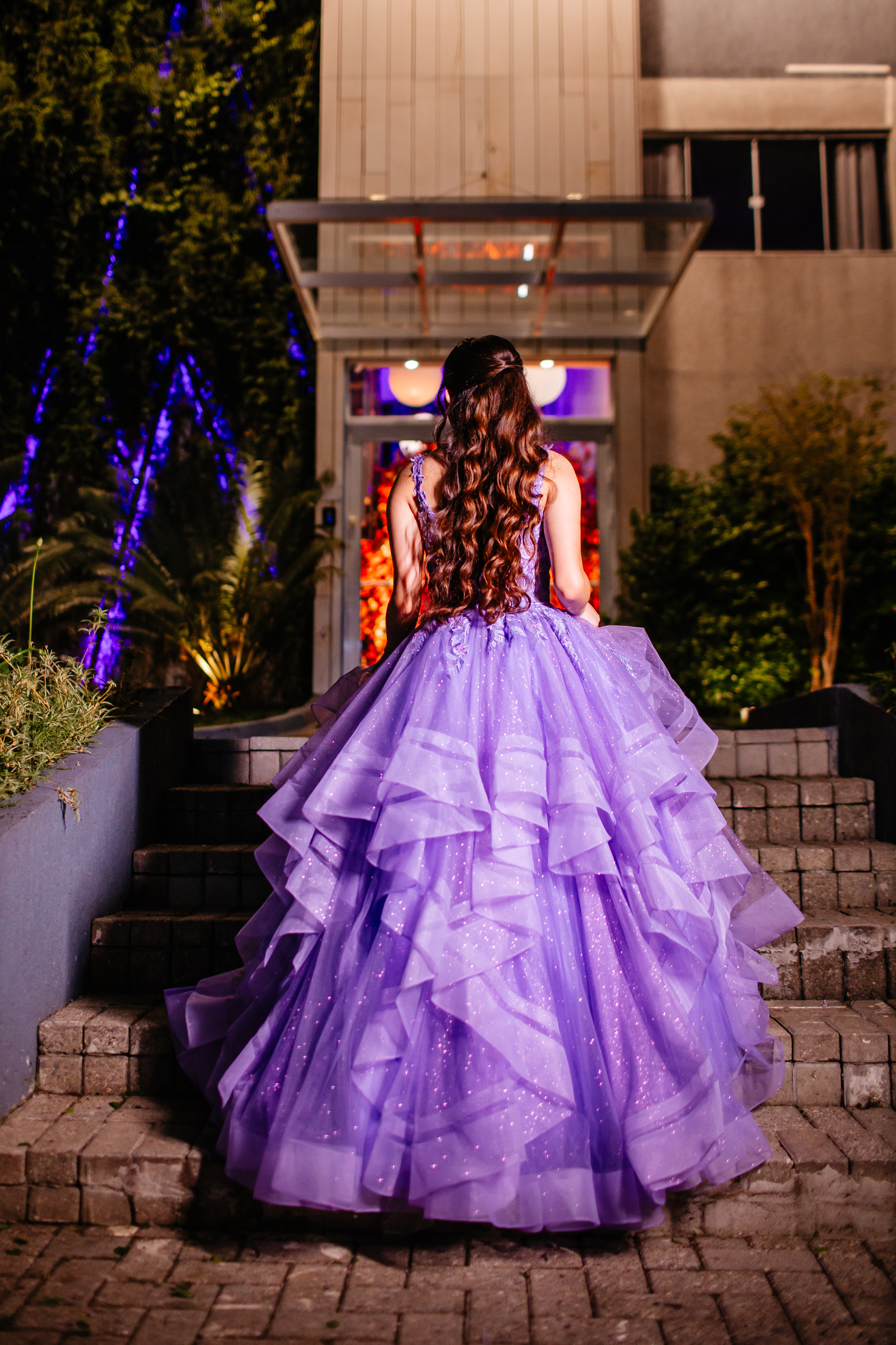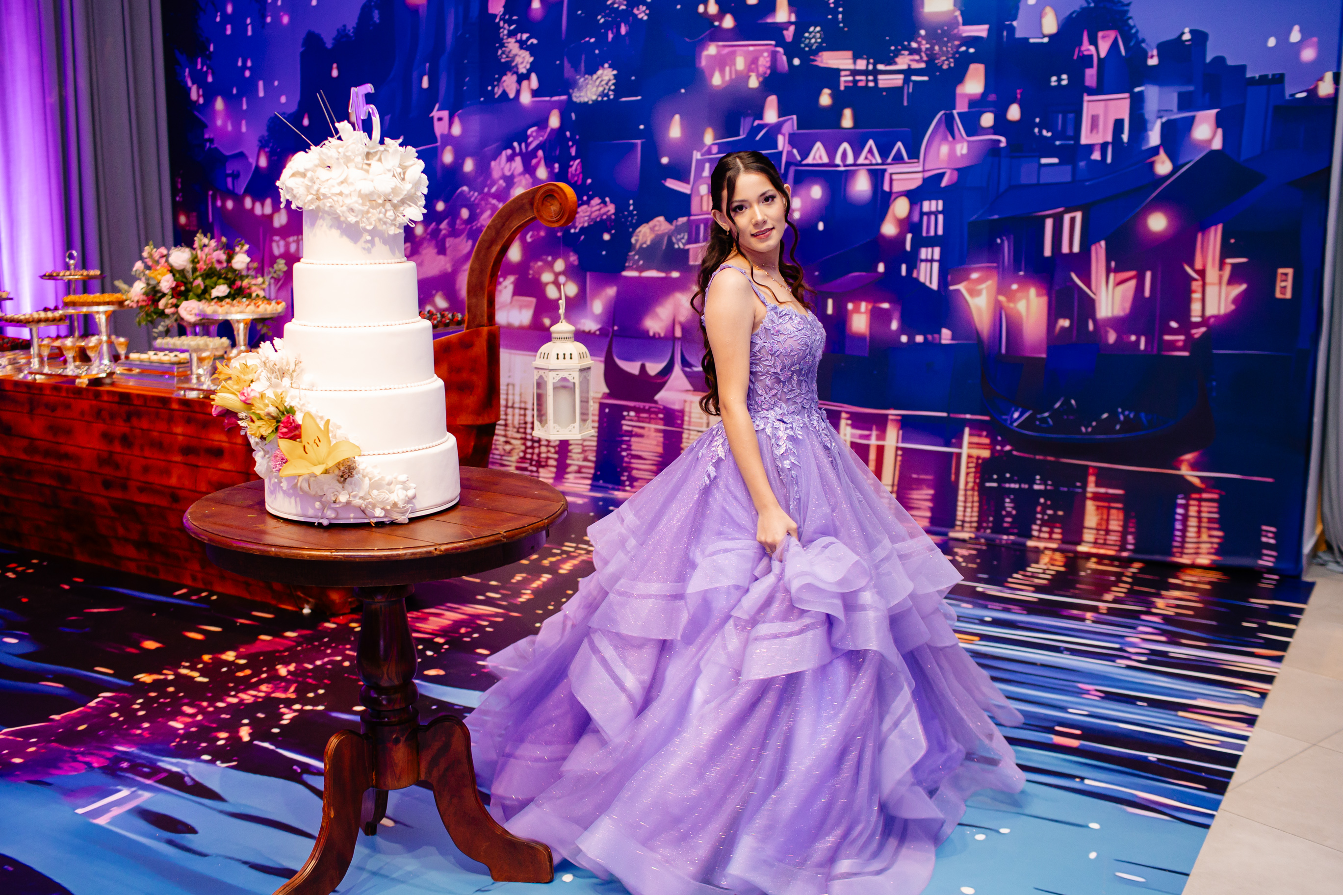 A debutante brilhou em um vestido lilás deslumbrante, e cada detalhe da decoração reforçou a proposta do evento: sofisticação, personalidade e emoção em perfeita harmonia.