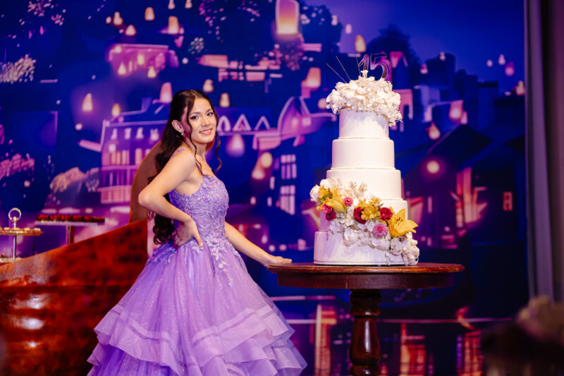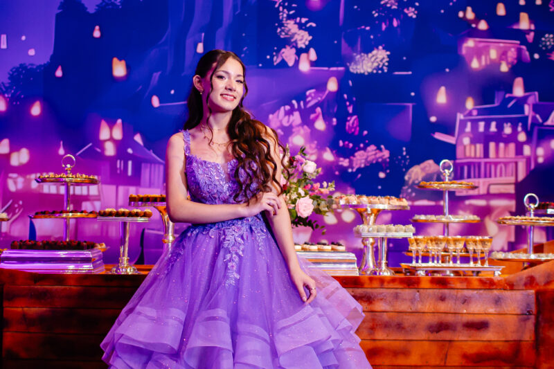 Com um projeto cenográfico impecável, iluminação sofisticada e ambientação exclusiva, o salão foi transformado em um cenário mágico, com lanternas flutuantes, tons lilás e dourado, e uma atmosfera que fez cada convidado se sentir dentro do filme.