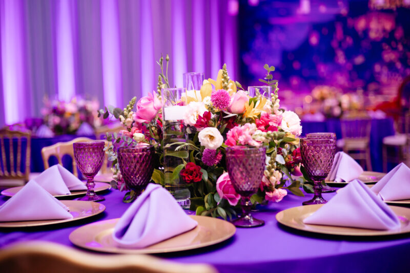• Iluminação cênica em tons roxos e dourados, que trouxe calor e encanto ao ambiente.