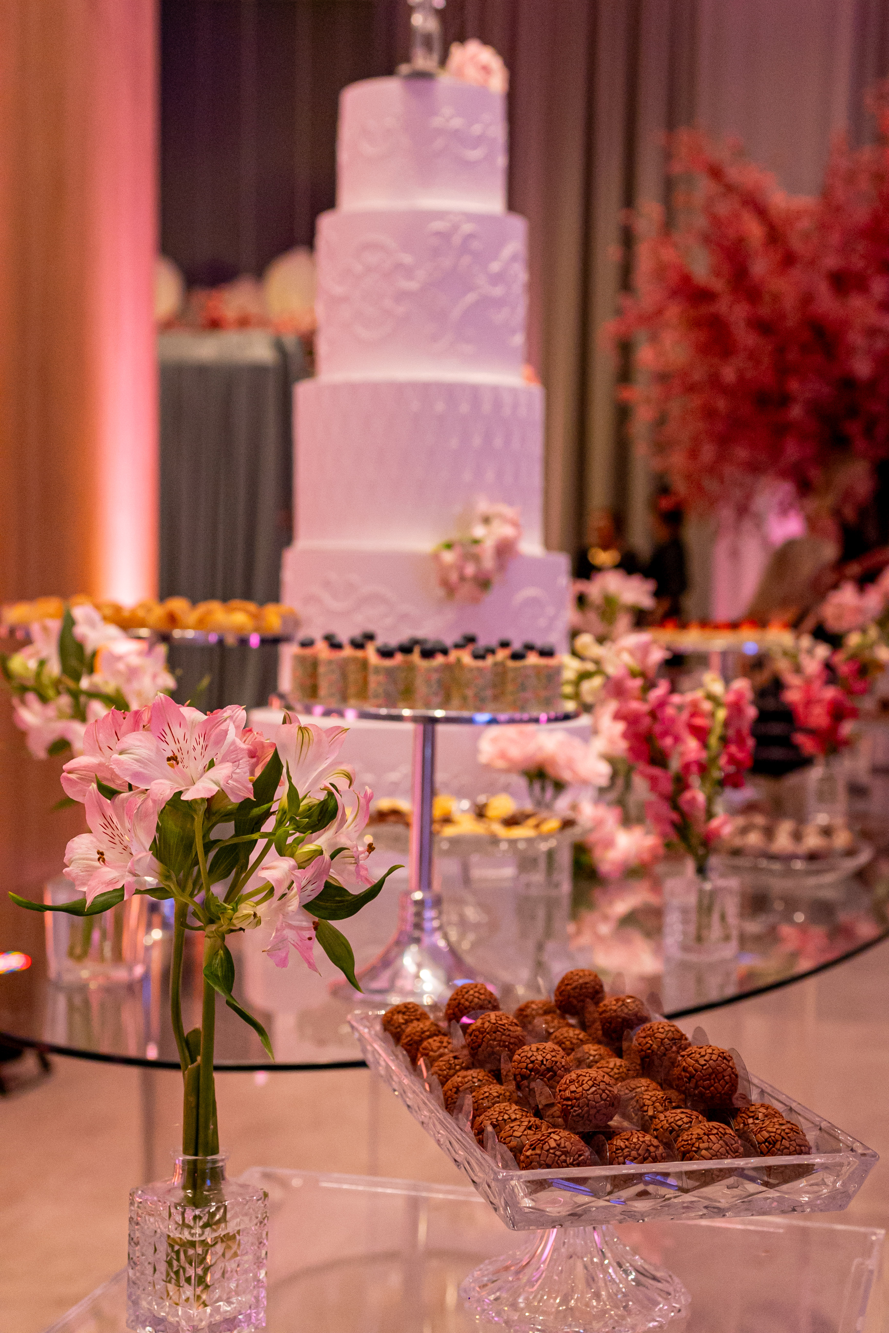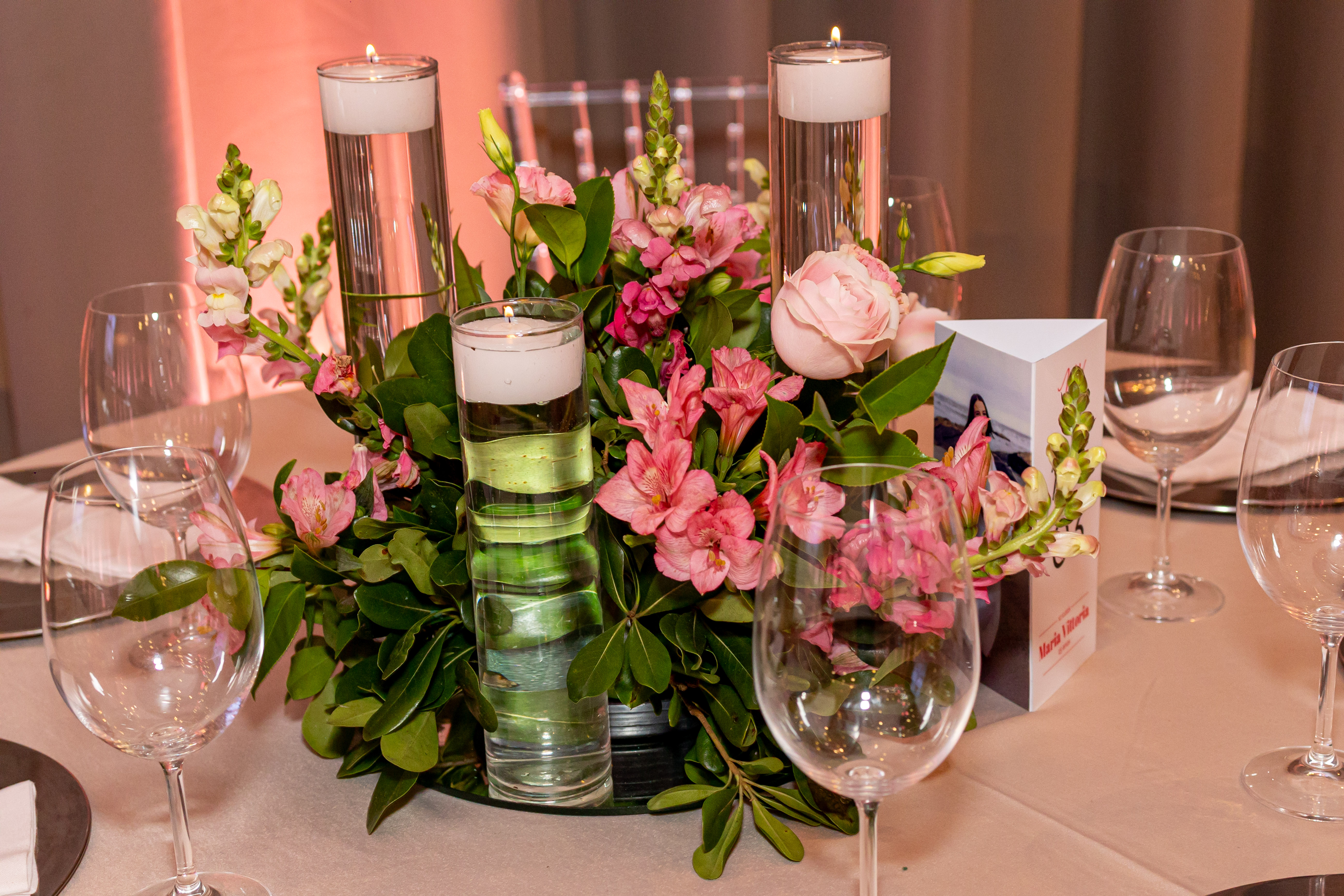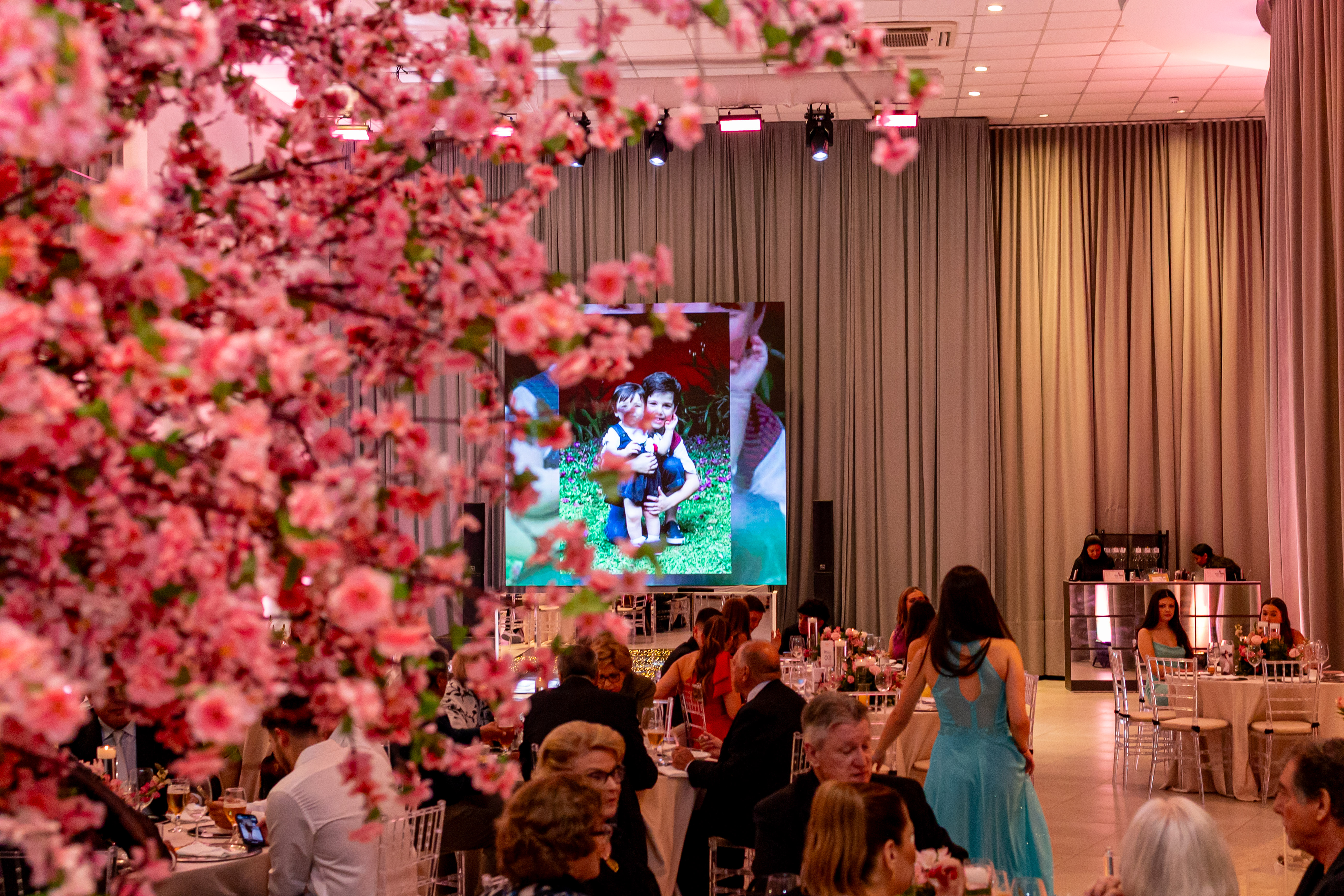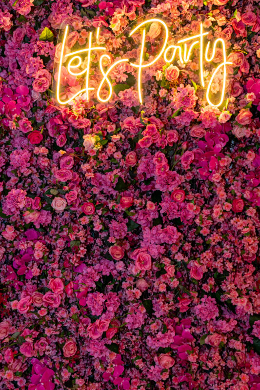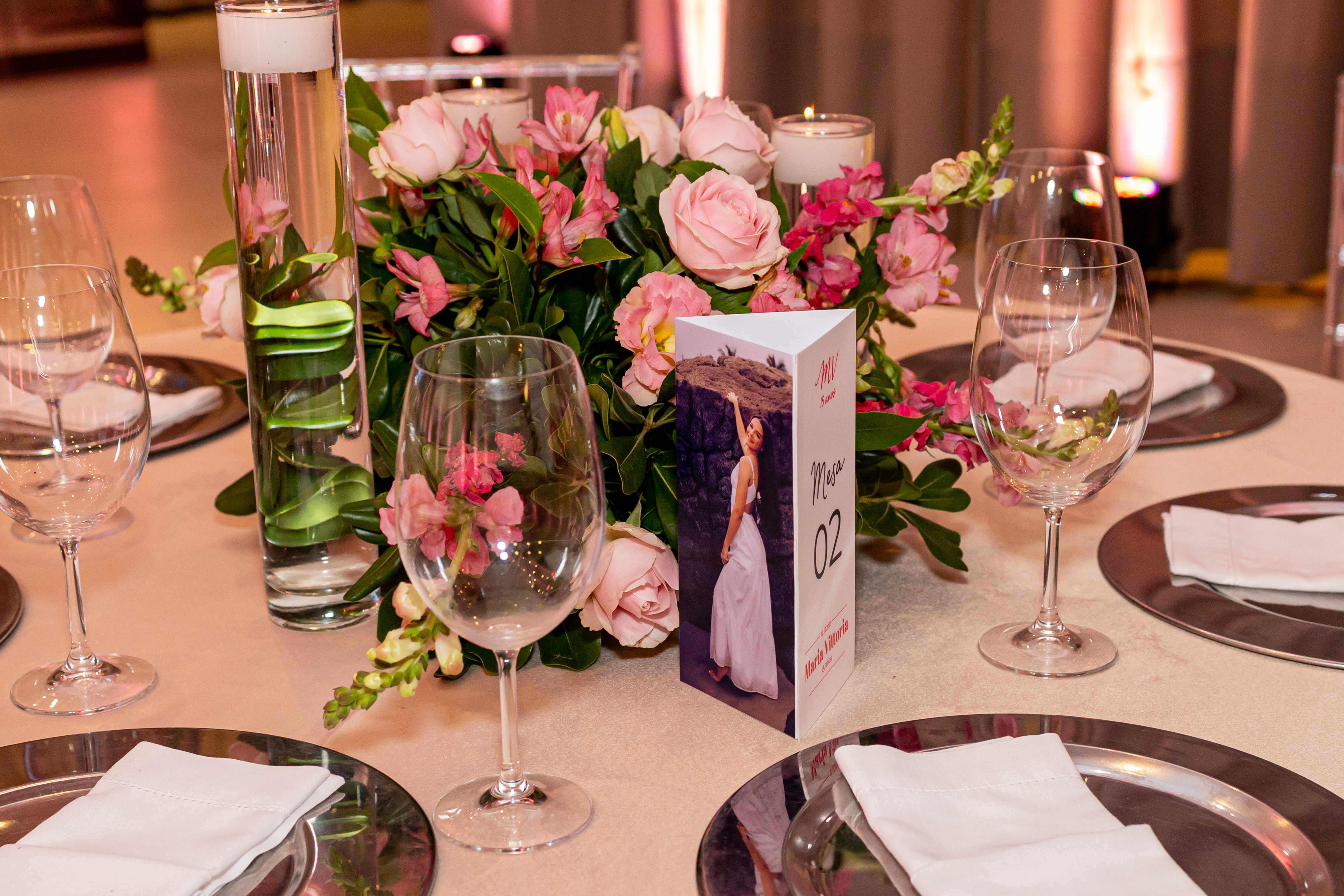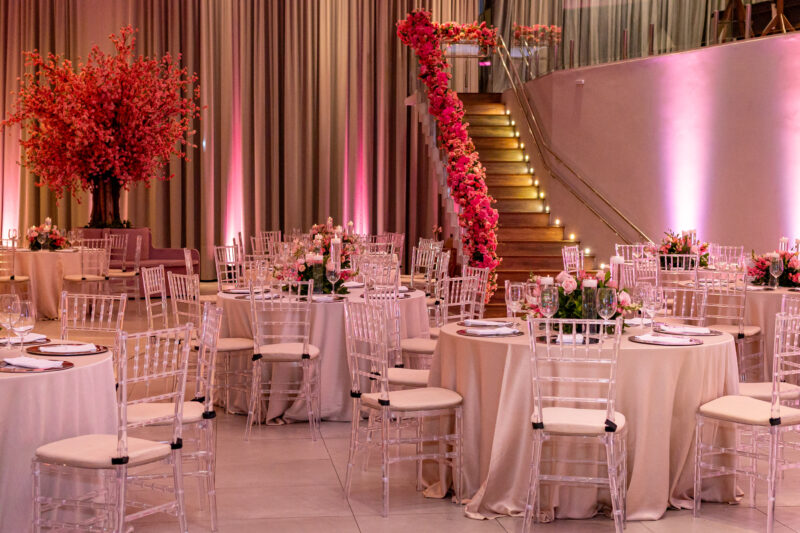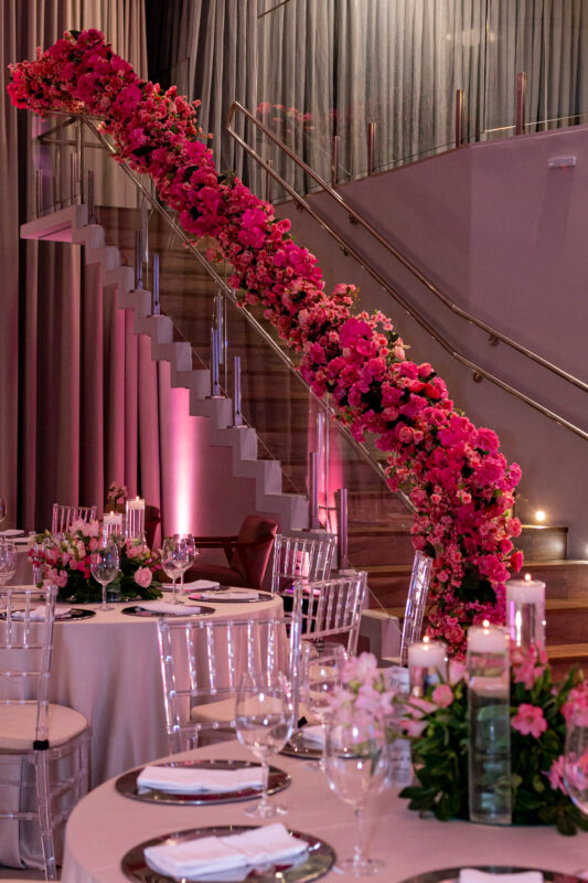 Desde a chegada dos convidados, o ambiente revelou uma cenografia sofisticada, com destaque para a decoração floral em tons vibrantes e a iluminação cênica que valorizou cada espaço do salão. A escadaria principal ganhou uma composição floral imponente, criando um dos cenários mais marcantes da festa e um dos pontos mais fotografados da noite.