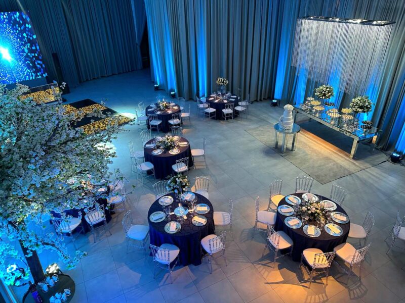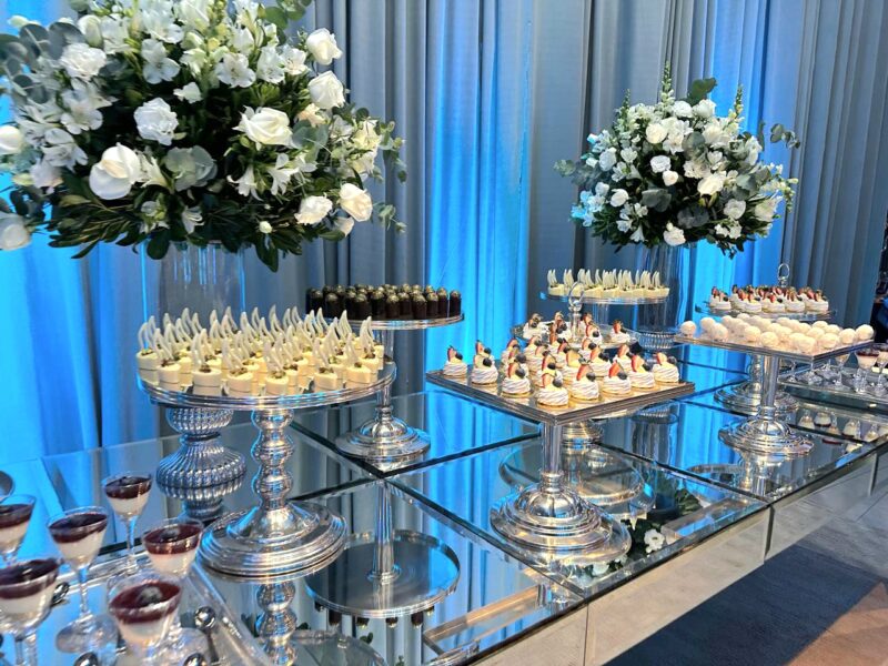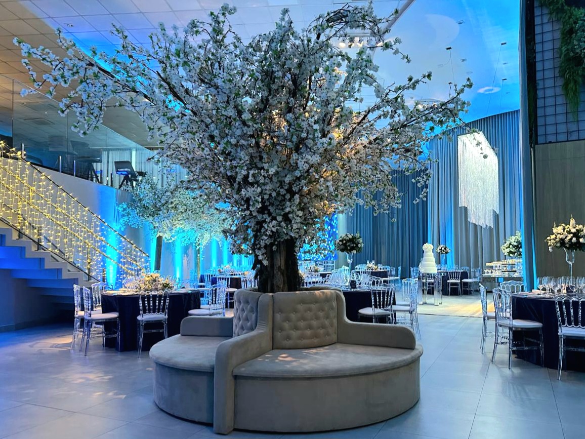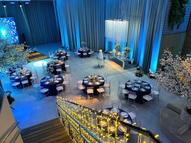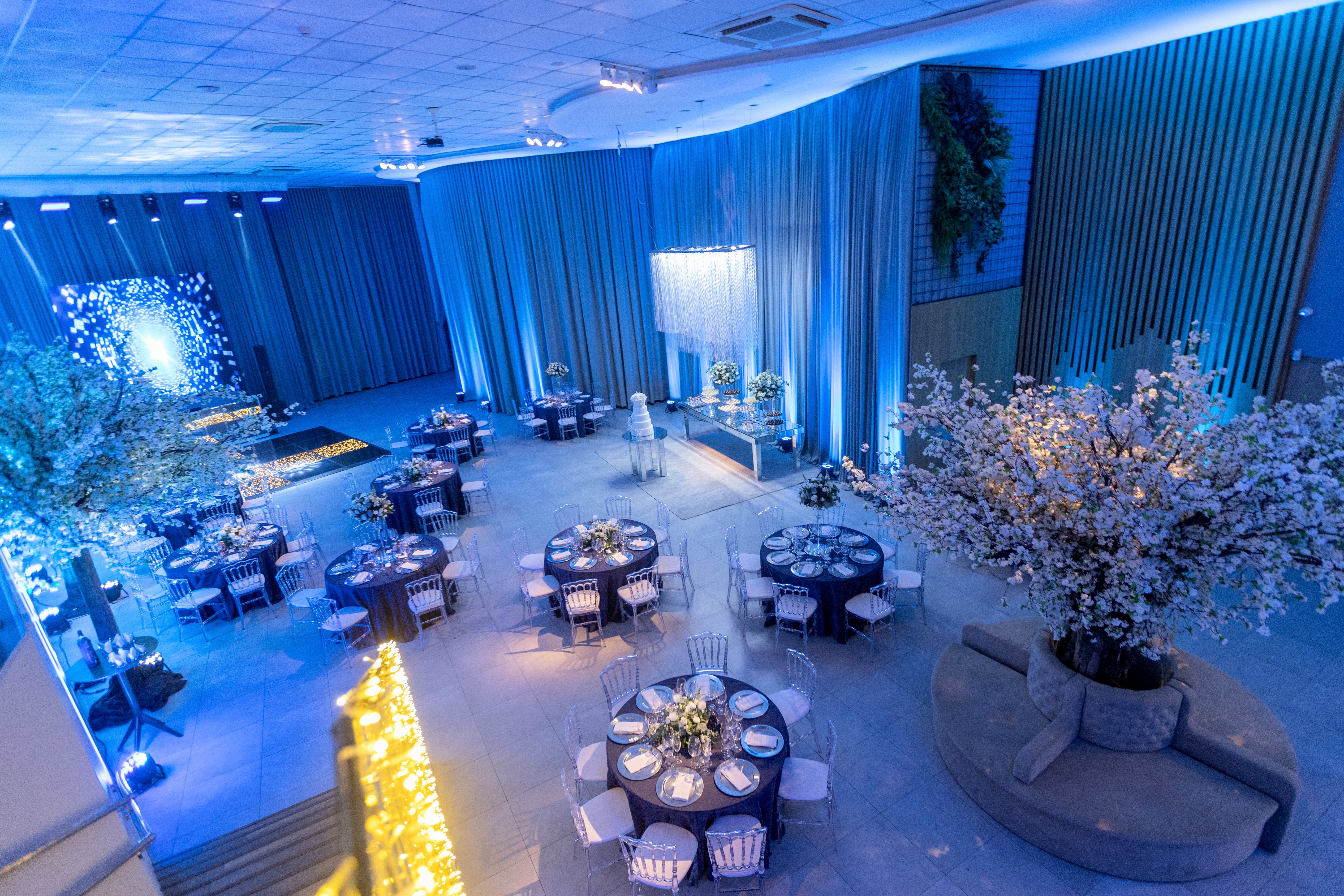A recepção dos convidados aconteceu em um ambiente elegante e cuidadosamente planejado, com mesas decoradas, iluminação arquitetural e espaços preparados para fotografia. A escadaria do Dreamland, um dos pontos mais marcantes do espaço, recebeu decoração especial e se tornou um dos cenários principais da festa.