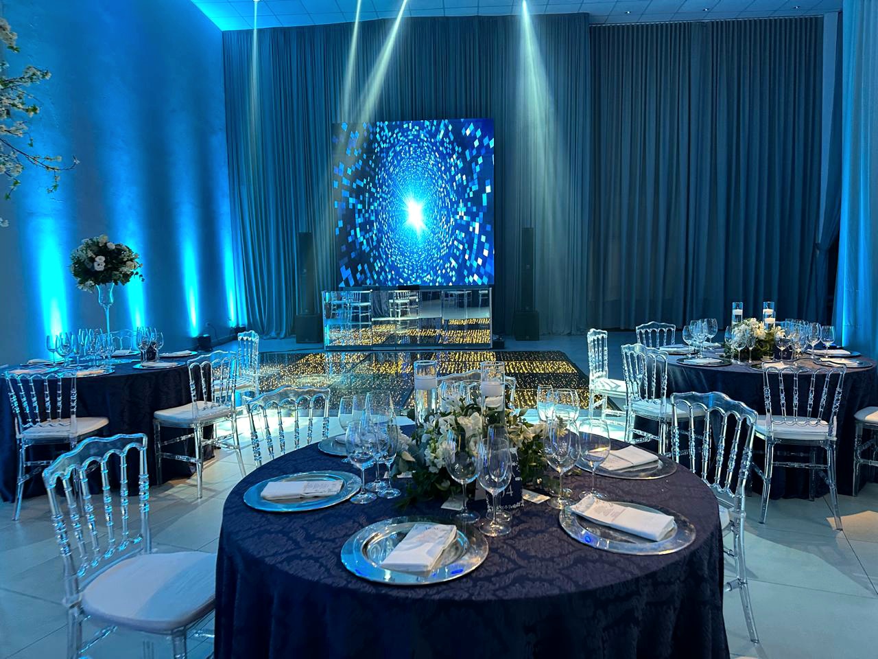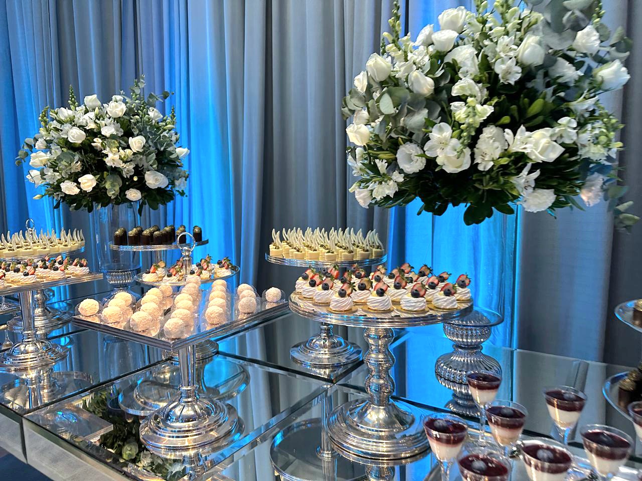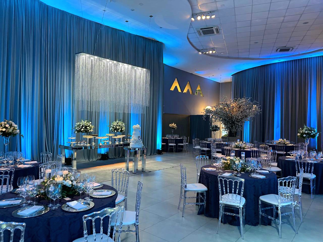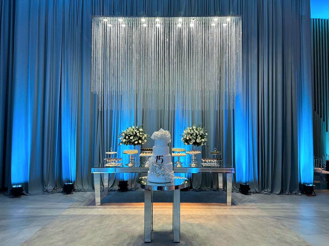 A mesa de doces e o bolo de 15 Anos foram posicionados em destaque no salão, compondo um cenário clássico e sofisticado, valorizado pela iluminação e pela arquitetura do espaço. A pista de dança iluminada e a estrutura de som e iluminação completaram a experiência da festa.